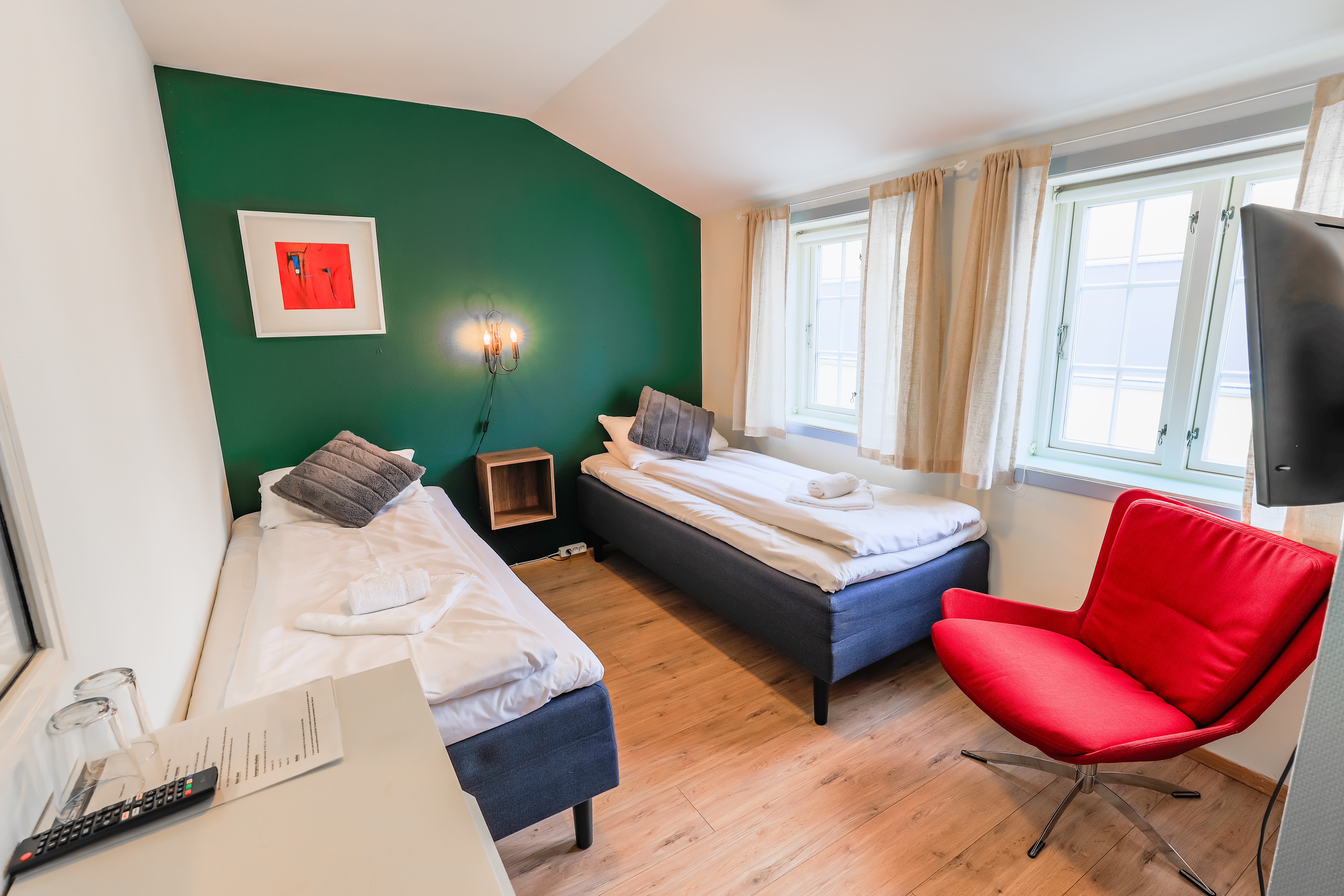 Nyt en god natts søvn i ett av våre familierom med utsikt over Jørpelandsvågen. Rommene har lyse møbler og består av 2 separate soverom med 2 enkle senger som er satt sammen til en dobbeltseng i soverom nr 1, og 2 enkle frittstående senger i soverom nr 2.