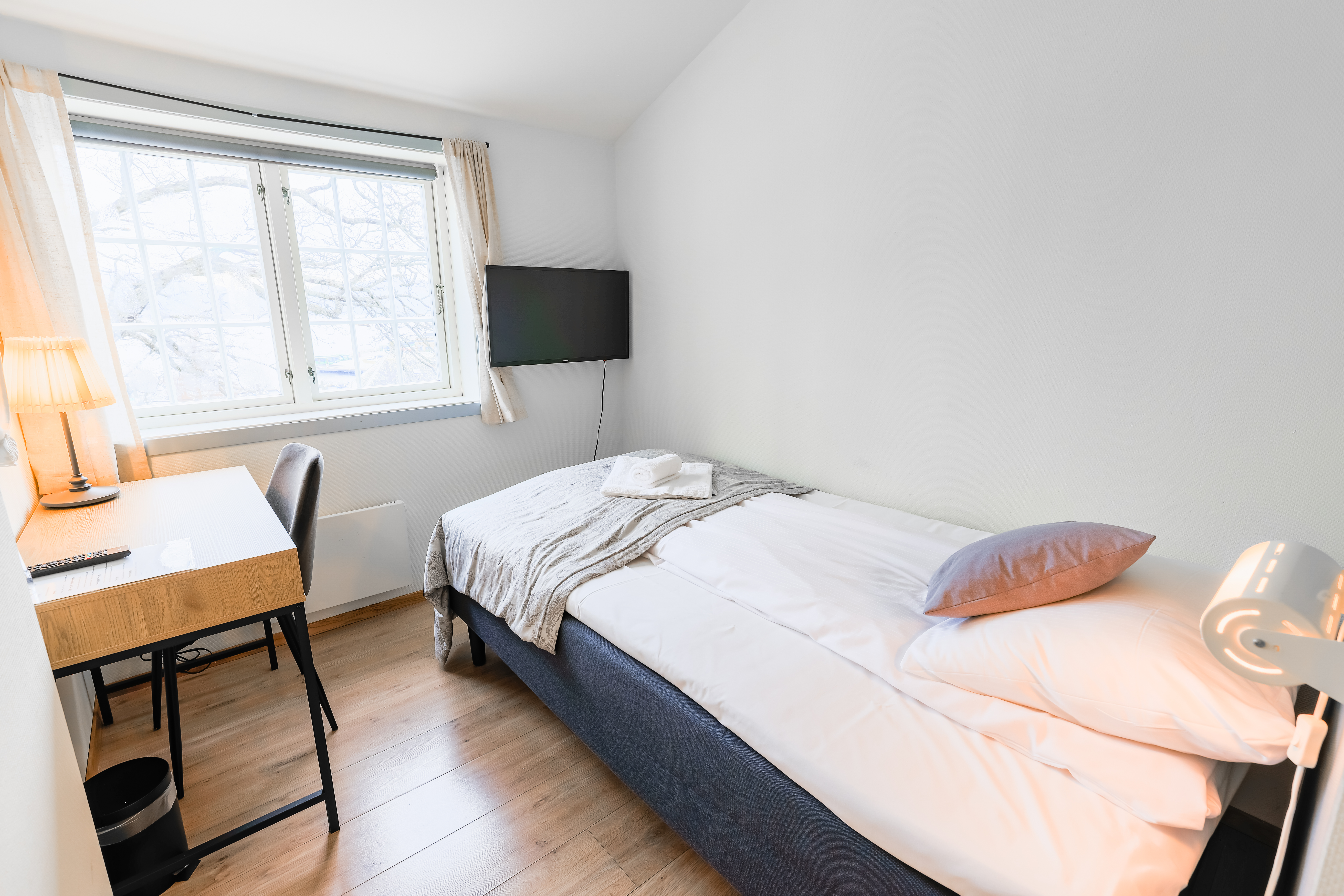 Nyt en god natts søvn i ett av våre økonomi dobbeltrom med utsikt over Jørpelandsvågen. Rommene har lyse møbler, 2 enkle senger som er satt sammen til en dobbeltseng, TV og varmeovn.